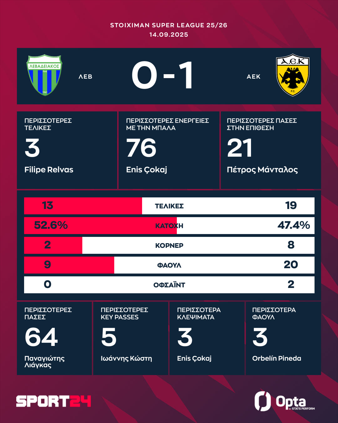 Η ΑΕΚ συνέχισε το απόλυτο στη Stoiximan Super League, καθώς επικράτησε 1-0 του Λεβαδειακού στην έδρα του. Ο Αμπουμπακαρί Κοϊτά ήταν ο λυτρωτής των κιτρινόμαυρων με την οβίδα που εξαπέλυσε στο 69ο λεπτό μετά την έξυπνη εκτέλεση φάουλ του Ελίασον.