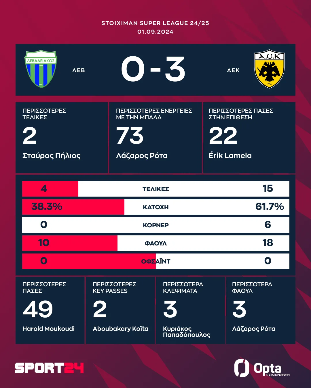 Η ΑΕΚ έκανε το καθήκον της στη Λιβαδειά, καθώς επικράτησε 3-0 του Λεβαδειακού. Οι κιτρινόμαυροι λίγο πριν από την εκπνοή του πρώτου μέρους άνοιξαν το σκορ με τον Κοϊτά στο 44ο λεπτό. Στην πρώτη της φάση στο δεύτερο μέρος η Ένωση έκανε το 2-0 με τον Ελίασον στο 52′ και ο Γκατσίνοβιτς διαμόρφωσε το τελικό σκορ στο 82′.