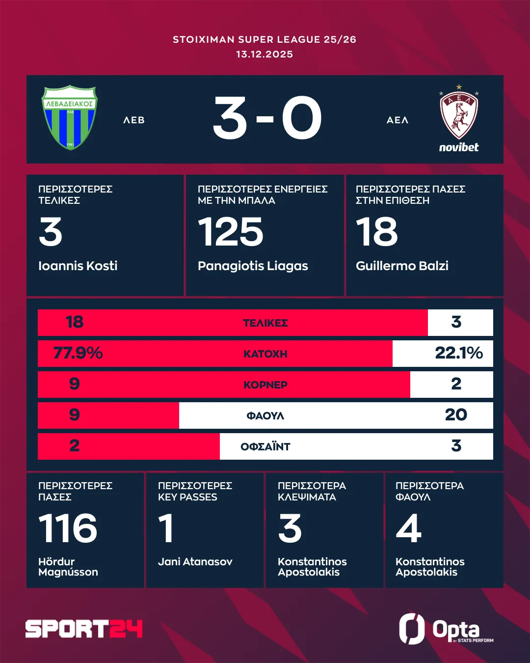 Με αυτό το αποτέλεσμα ο Λεβαδειακός έφτασε τους 25 βαθμούς, παραμένοντας στην 4η θέση, ενώ οι Θεσσαλοί συνεχίζουν προτελευταίοι με μόλις οκτώ πόντους.