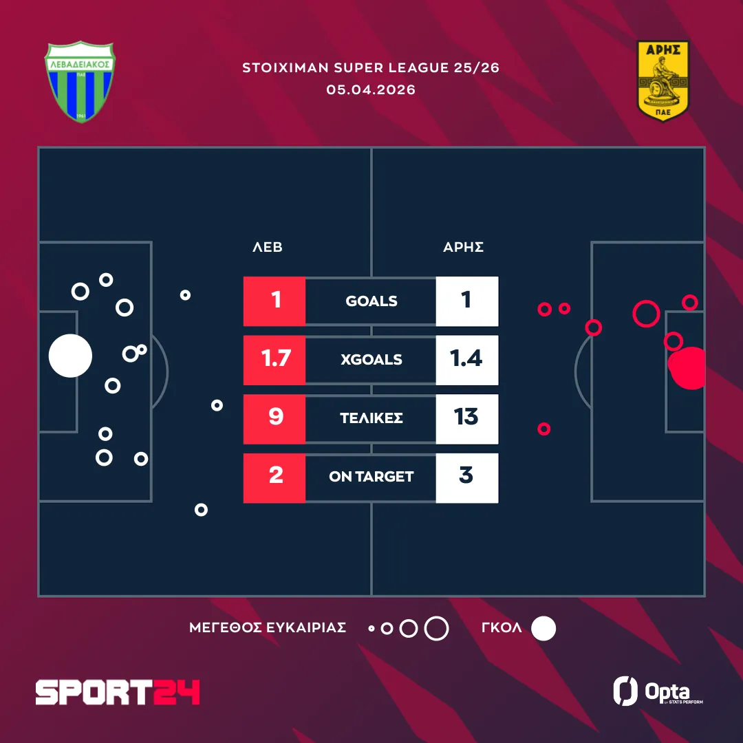 Ισόπαλη (1-1) έληξε η μάχη της πρεμιέρας στο Λάμπρος Κατσώνης μεταξύ Λεβαδειακού και Άρη με τους Βοιωτούς να βγαίνουν κερδισμένοι από την πρεμιέρα των playoffs 5-8.