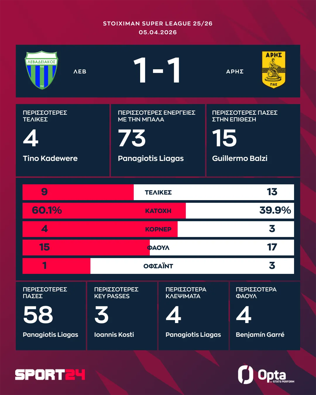 Λεβαδειακός – Άρης 1-1: Οι Βοιωτοί έσωσαν την παρτίδα με Τσάπρα – Βέρμπιτς και είναι οι κερδισμένοι της πρεμιέρας