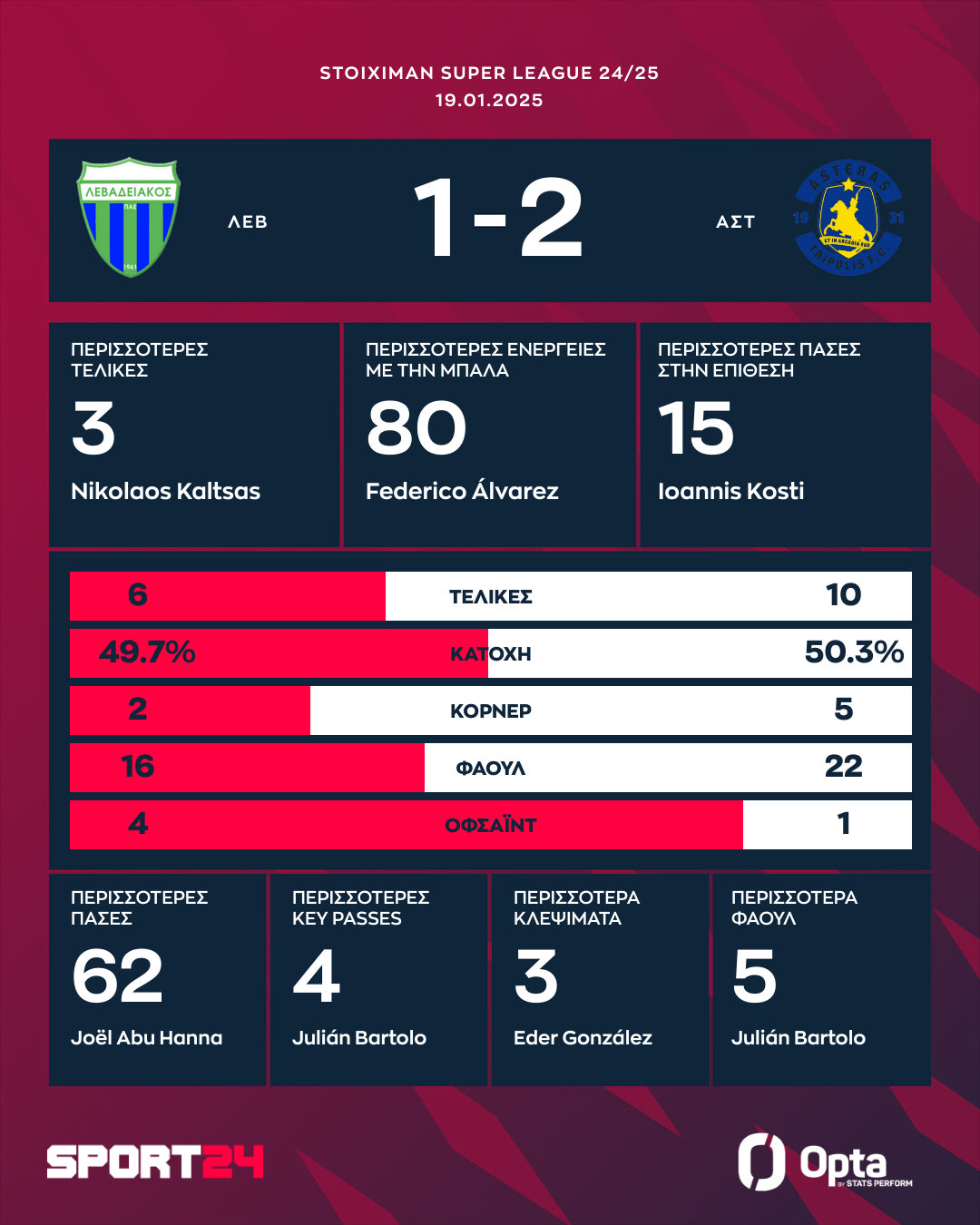 Ο Λεβαδειακός προηγήθηκε με γκολ του Ζίνι, όμως ο Αστέρας AKTOR είχε την απάντηση, κάνοντας την ανατροπή με 1-2 με την εύστοχη εκτέλεση πέναλτι του Μακέντα στο 90+4' για τη 19η αγωνιστική της Stoiximan Super League.