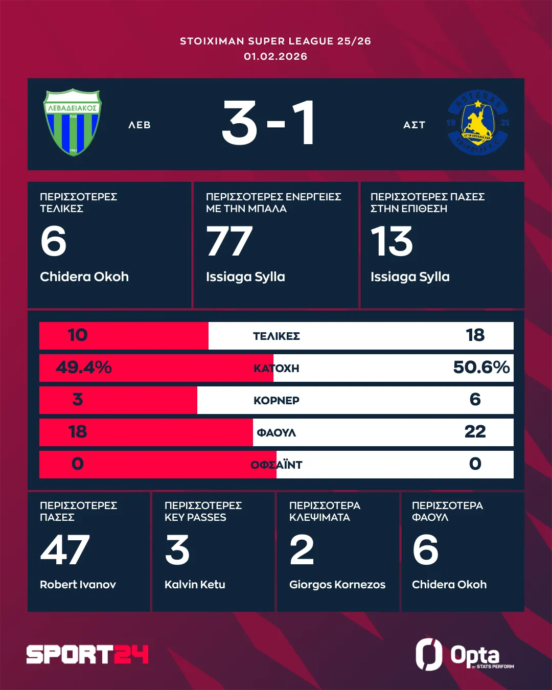 O Λεβαδειακός είναι ασταμάτητος. Οι Βοιωτοί παραμένουν αήττητοι μέσα στο 2026, καθώς επικράτησαν 3-1 του Αστέρα ΑΚΤΟR για την 19η αγωνιστική της Stoiximan Super League και οι υψηλές τους πτήσεις φυσικά συνεχίζονται.