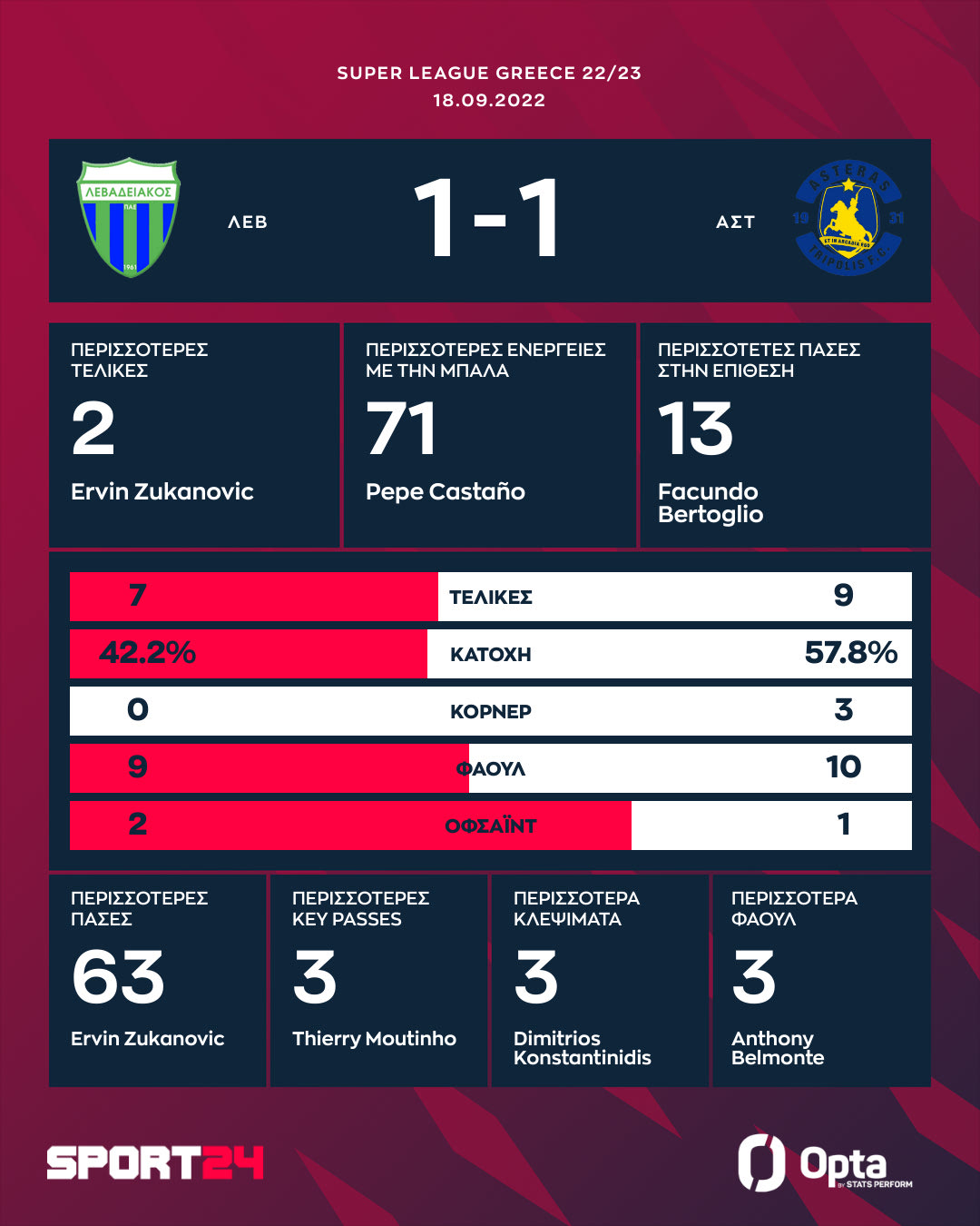Ο Λεβαδειακός έδωσε το πρώτο του παιχνίδι στη Λιβαδειά κόντρα στον Αστέρα, με τις δύο ομάδες να αναδεικνύονται ισόπαλες 1-1 και να μη σημειώνουν ούτε τώρα την πρώτη τους νίκη στη Super League. Οι Βοιωτοί άνοιξαν το σκορ στο 48ο λεπτό με τον Λιάγκα και οι φιλοξενούμενοι απάντησαν με τον Καστάνιο στο 54ο λεπτό.