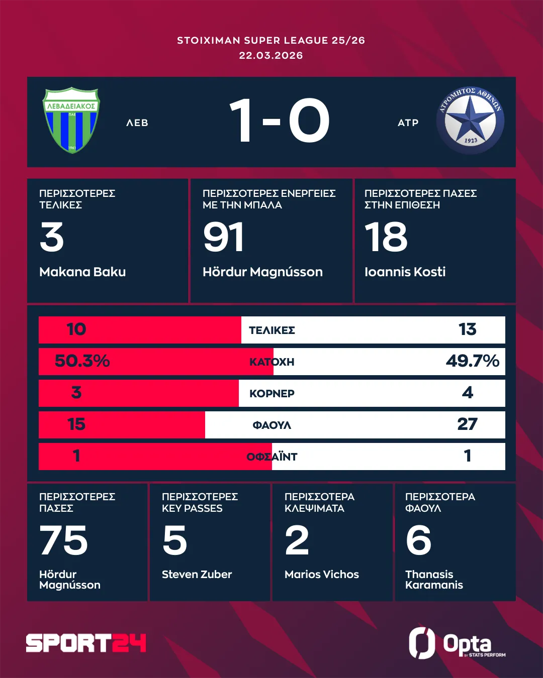 Πρώτη νίκη για τον Λεβαδειακό μετά τον Φλεβάρη, με τους Βοιωτούς να επικρατούν 1-0 του Ατρομήτου. Οι Περιστεριώτες μπήκαν στα playoffs 5-8 παρά τη νίκη.