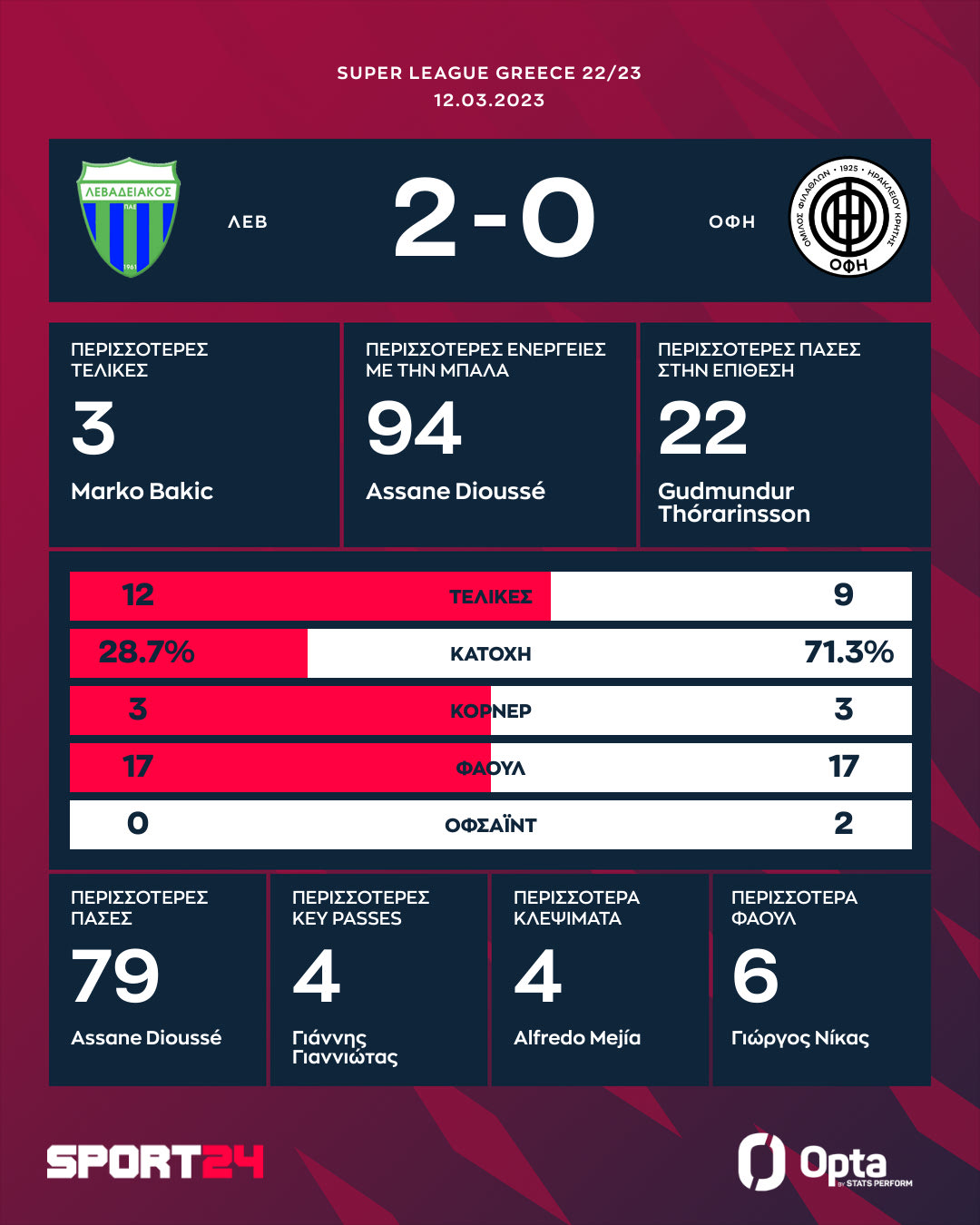 Ο ουραγός Λεβαδειακός επιβλήθηκε του ΟΦΗ με 2-0 για την 26η αγωνιστική της Stoiximan Super League και πήρε ένα τρίποντο ψυχολογίας στη μάχη που δίνει για την παραμονή στην κατηγορία.