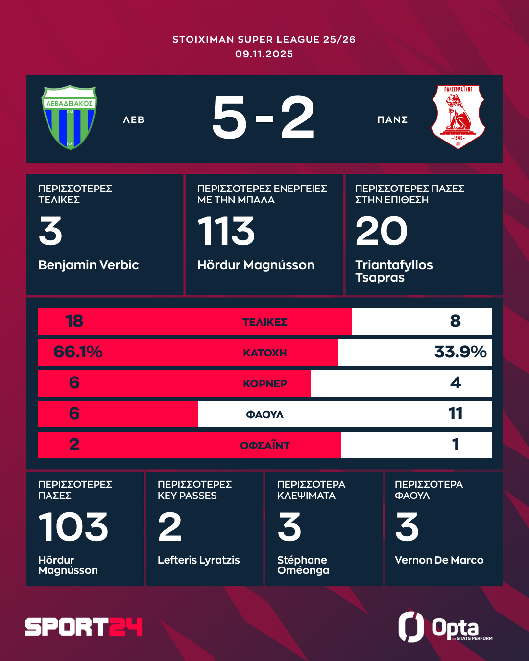 Ο Λεβαδειακός έτσι πήρε τρίτη συνεχόμενη νίκη εντός των συνόρων και φιγουράρει στην τέταρτη θέση της Stoiximan Super League με 18 βαθμούς. Αντίθετα ο Πανσερραϊκός, που είχε στον πάγκο του τον Αλέξανδρο Βεργώνη, γνώρισε τέταρτη διαδοχική ήττα, δέχθηκε για δεύτερο σερί ματς πέντε γκολ και είναι ουραγός με 5 βαθμούς.