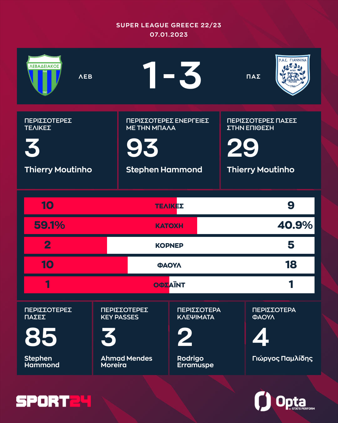 Μετά τη μεγάλη νίκη επί της ΑΕΚ, ο ΠΑΣ Γιάννινα συνέχισε με ακόμη ένα τρίποντο. Οι Ηπειρώτες επικράτησαν 3-1 του Λεβαδειακού με όμορφα γκολ για τη δεύτερη σερί νίκη στο πρωτάθλημα. Μάλιστα, η ομάδα του Στάικου είναι αήττητη για τέσσερα παιχνίδια. Αυτό ήταν το πρώτο διπλό για τον ΠΑΣ, έπειτα από περίπου έναν χρόνο.
