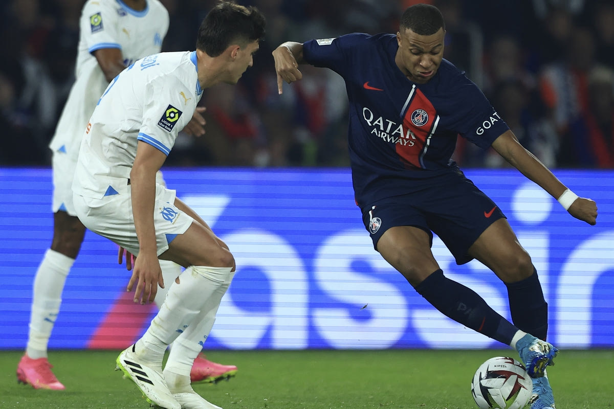 Ο Κιλιάν Εμπαπέ, δεξιά, σε μονομαχία με τον Λεονάρντο Μπαλέρντι, αριστερά, στο ματς ανάμεσα στην Παρί και τη Μαρσέιγ @2023 AP Images/Aurelien Morissard