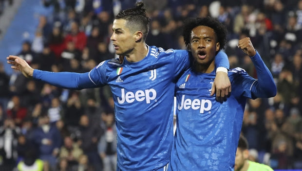 Juventus' Cristiano Ronaldo, left, celebrates with teammate Juan Cuadrado after scoring his side's first goal, during an Italian Serie A soccer match between Spal and Juventus at the Paolo Mazza stadium in Ferrara, Italy, Saturday, Feb. 22, 2020. (Filippo Rubin/LaPresse via AP)