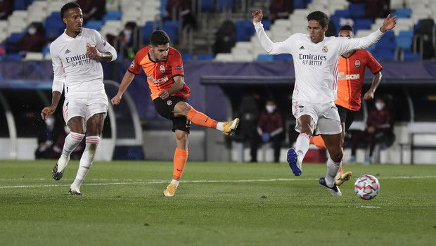 Shakhtar's Manor Solomon scores his side's third goal during the Champions League, group B soccer match between Real Madrid and Shakhtar Donetsk at Alfredo di Stefano stadium in Madrid, Spain, Wednesday, Oct. 21, 2020. (AP Photo/Manu Fernandez)