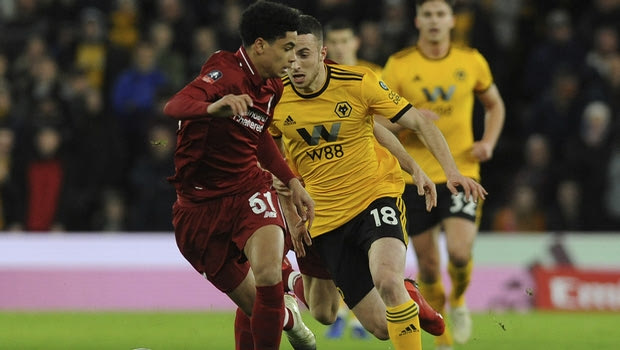 Liverpool's Ki-Jana Hoever, left, vies for the ball with Wolverhampton's Diogo Jota during the English FA Cup third round soccer match between Wolverhampton Wanderers and Liverpool at the Molineux Stadium in Wolverhampton, England, Monday, Jan. 7, 2019. (AP Photo/Rui Vieira)