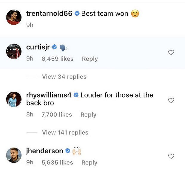 Η άποψη αυτή εκφράζει -όπως είναι λογικό- ομόφωνα τους παίκτες του Κλοπ, με τον αρχηγό Τζόρνταν Χέντερσον αλλά και τους Κέρτις Τζόουνς και Ρις Γουίλιαμς να δείχνουν πως συμφωνούν και επαυξάνουν μέσω emoji με τα οποία σχολίασαν την ανάρτηση του Άγγλου διεθνούς δεξιού μπακ.
