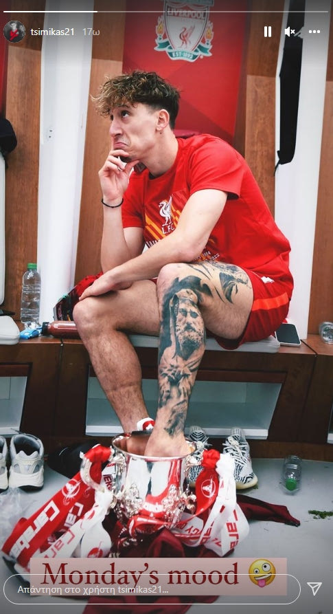 Ο Κώστας Τσιμίκας πανηγύρισε έξαλλα την κατάκτηση του League Cup με τη φανέλα της Λίβερπουλ, καθώς δεν έμεινε μόνο στον χορό και στους πανηγυρισμούς με τους φίλους της ομάδας, αλλά έβαλε και τα πόδια του στο τρόπαιο, όντας ευδιάθετος για την κατάκτηση του τροπαίου.