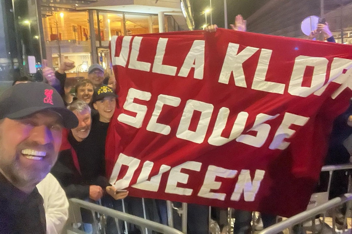 Ο Γιούργκεν Κλοπ χαμογελάει για το πανό που δημιούργησαν οι φίλοι της Λίβερπουλ για τη σύζυγό του, Ούλα