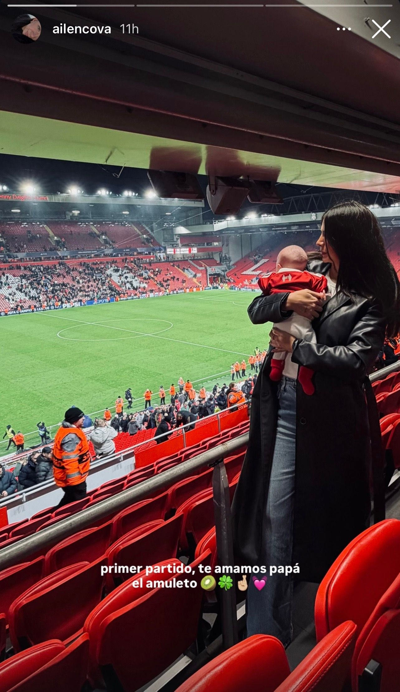 Η Αϊλέν Κόβα, που βρισκόταν στις κερκίδες του Άνφιλντ, ανάρτησε με τη σειρά της ένα τρυφερό story, όπου κρατά στην αγκαλιά την κόρη τους και γράφει: “Πρώτο παιχνίδι. Σε αγαπάμε μπαμπά. Το φυλαχτό σου”