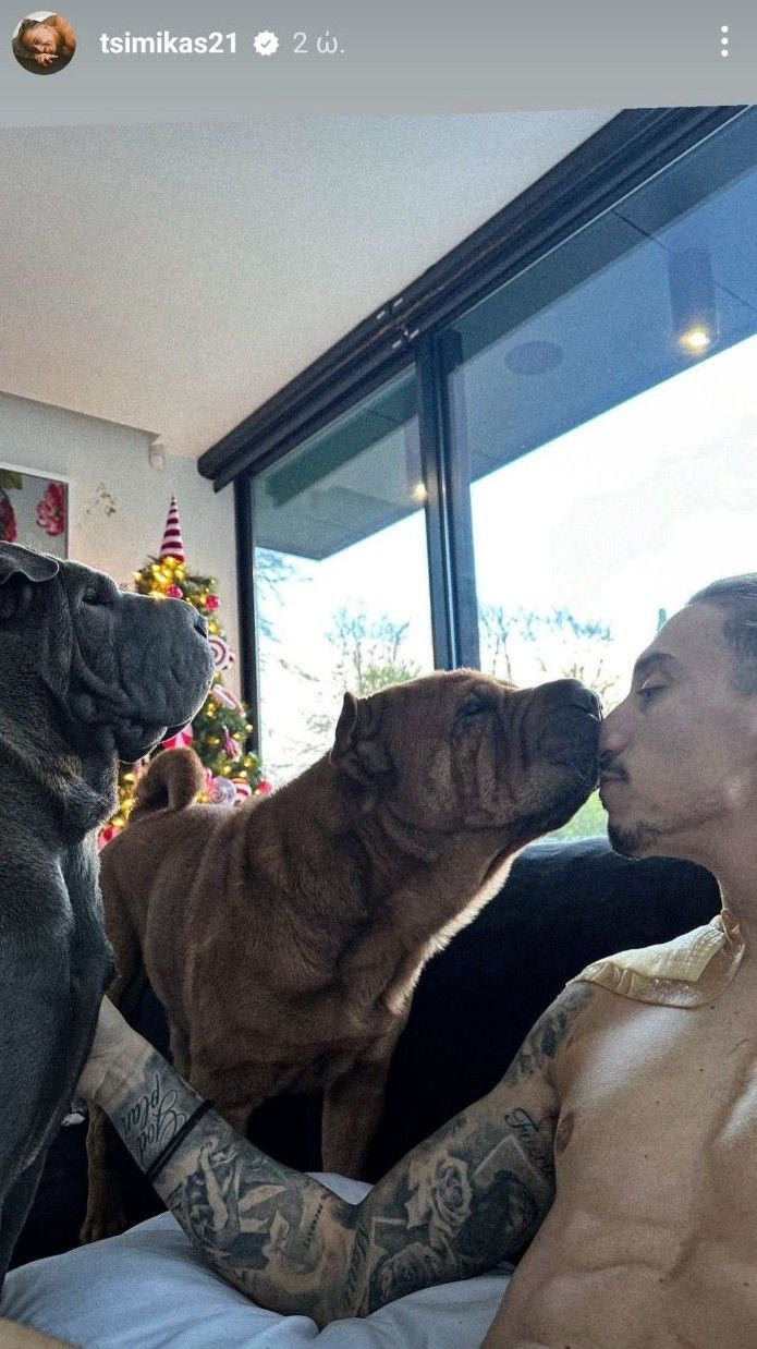 Ο Κώστας Τσιμίκας έκανε story στο Instagram μαζί με τους δύο τους σκύλους, ενώ φαίνεται και ο επίδεσμος στον ώμο του, από τον πρόσφατο τραυματισμό του.