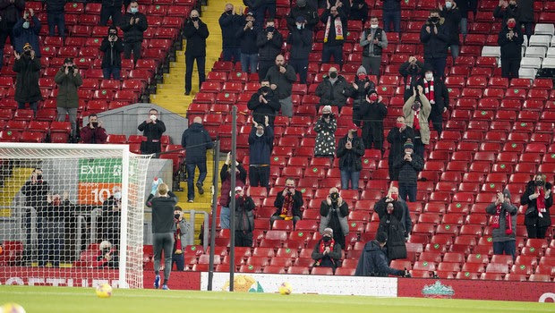 Οι φίλοι της ομάδας του Κλοπ εννιά μήνες μετά την τελευταία τους παρουσία στο Άνφιλντ μπόρεσαν να βρεθούν και πάλι στο γήπεδο και να δουν την αγαπημένη τους ομάδα από κοντά. Κάθισαν στο κέντρο του γηπέδου, τήρησαν τις αποστάσεις, φόρεσαν τις μάσκες τους αλλά μπόρεσαν να τραγουδήσουν το αγαπημένο τους “You’ll never walk alone“.