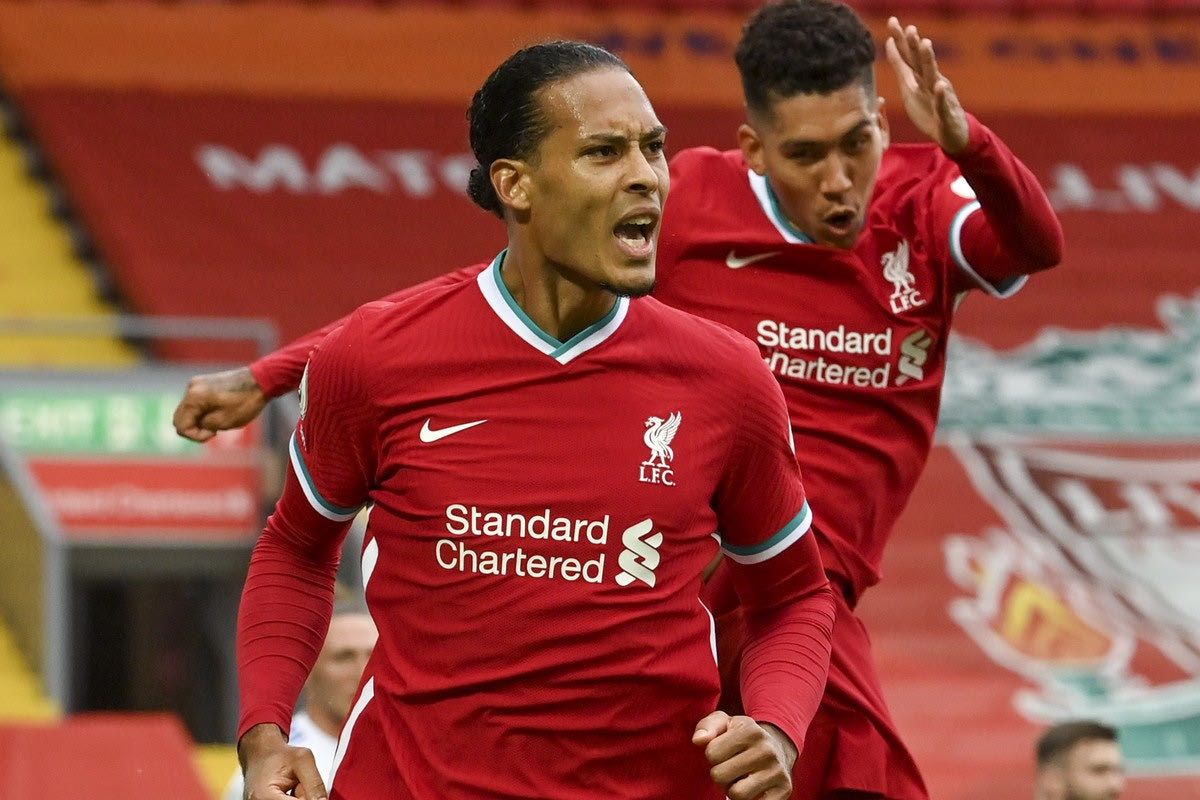 Liverpool's Virgil van Dijk, left, celebrates with Liverpool's Roberto Firmino after he scored his side's second goal during the English Premier League soccer match between Liverpool and Leeds United, at the Anfield stadium, in Liverpool, Saturday, Sept. 12, 2020. (Paul Ellis, Pool via AP)