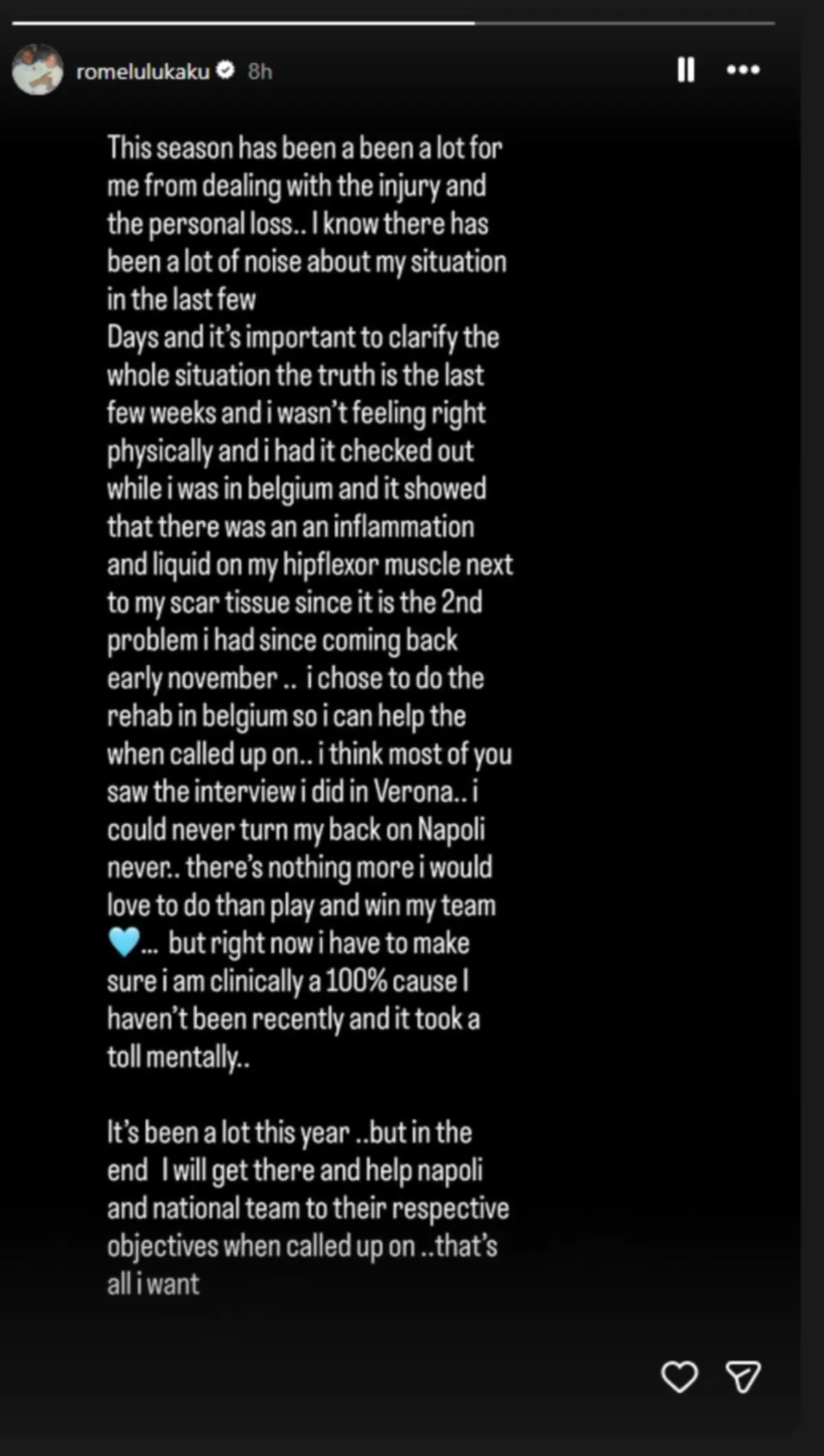 Ήταν μια δύσκολη χρονιά αλλά στο τέλος, θα την ξεπεράσω και θα βοηθήσω τη Νάπολι και την εθνική ομάδα να πετύχουν τους στόχους τους όταν κληθώ. Αυτό είναι το μόνο που θέλω”, ανέφερε χαρακτηριστικά ο Λουκάκου.