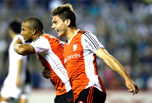 Ο Λούκας Μπογέ (δεξιά) πανηγυρίζει μαζί με τον Κάρλος Αντρές Σάντσες το γκολ του δεύτερου στον αγώνα της Ρίβερ Πλέιτ με την Λιμπερτάδ της Παραγουάης για την Copa Sudamericana τον Οκτώβριο του 2014 (AP PhotoJorge Saenz)
