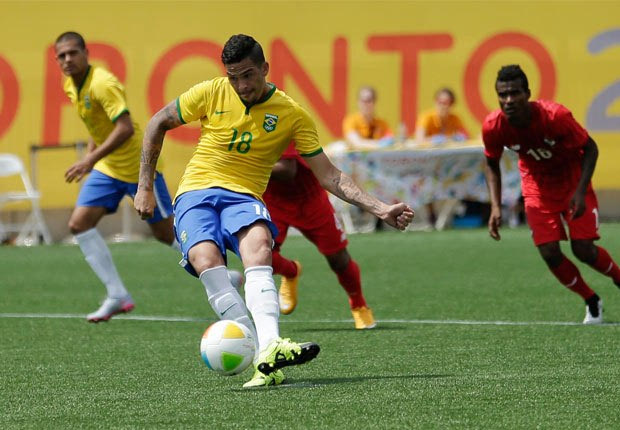 Ο Λουτσιάνο σκοράρει με πέναλτι εναντίον του Παναμά, στον μικρό τελικό των Παναμερικανικών Αγώνων του Καναδά, στις 25 Ιουλίου του 2015 (AP Photo/Gregory Bull)