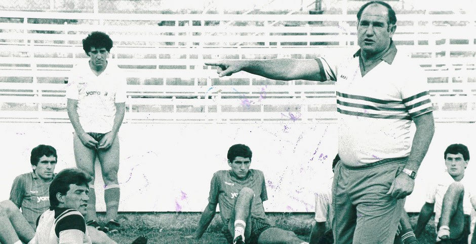 Ο Μανόλο Κόρδο όρθιος μιλάει στους παίκτες του στη διάρκεια προπόνησης τη σεζόν 1984-85. Από αριστερά: Νίμο, Πάκο Μπούγιο (μετέπειτα τερματοφύλακας της Ρεάλ), Φρανθίσκο Λόπεθ Αλφάρο (νυν προπονητής της Sevilla C), Μανόλο Χιμένεθ, Ραμόν Μπάθκεθ.