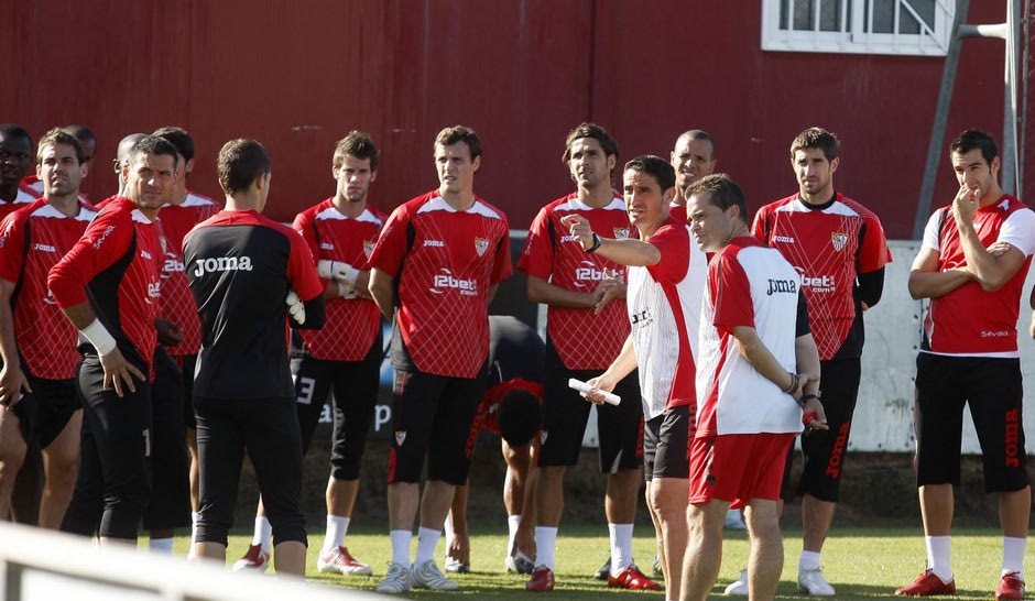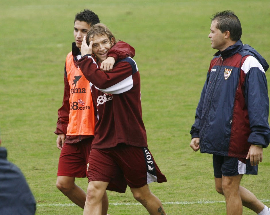 Ο Χεσούς Καλντερόν μαζί με τους Καπέλ και Νάβας στη διάρκεια προπόνησης της Sevilla FC.