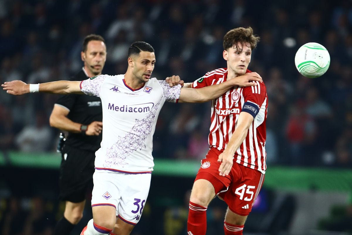 Ο Ρολάντο Μαντράγκορα σε μονομαχία του με τον Παναγιώτη Ρέτσο, στον τελικό του Conference League μεταξύ της Φιορεντίνα και του Ολυμπιακού | 29 Μαΐου 2024 Eurokinissi Sports