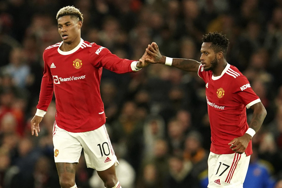 Ο Μάρκους Ράσφορντ με τον Φρεντ πανηγυρίζει το γκολ που σημείωσε © 2021 Dave Thompson / AP Images