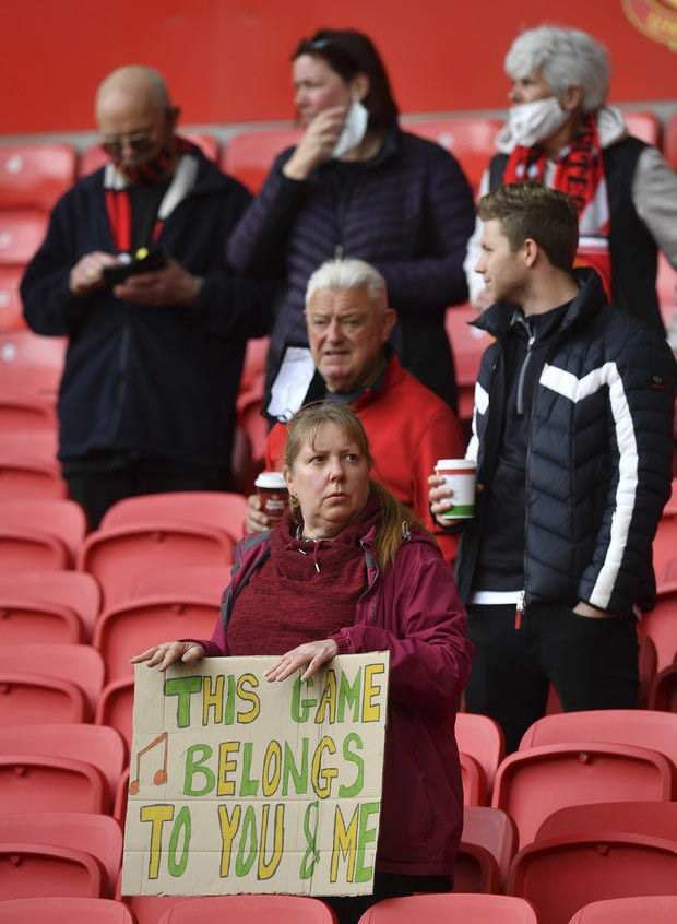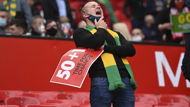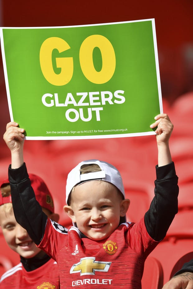 A Manchester United fan holds a "Go Glazers Out" banner inside the stadium before the English Premier League soccer match between Manchester United and Fulham at Old Trafford stadium in Manchester, England, Tuesday, May 18, 2021. (AP Photo/Paul Ellis, Pool) @ 2021 Paul Ellisu/Associated Press