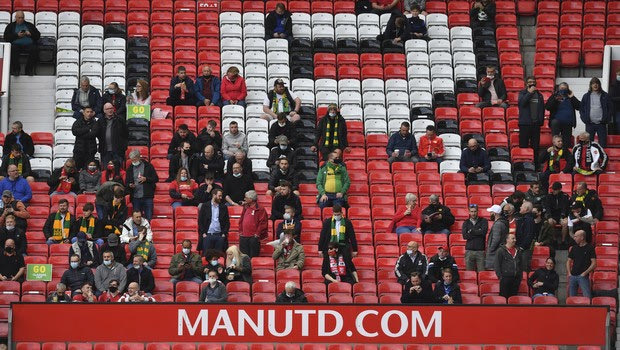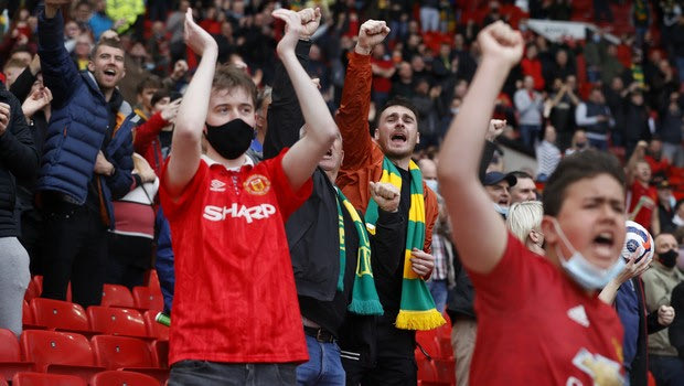 Manchester United fans inside the stadium before the English Premier League soccer match between Manchester United and Fulham at Old Trafford stadium in Manchester, England, Tuesday, May 18, 2021. (AP Photo/Paul Ellis, Pool) @ 2021 Paul Ellisu/Associated Press