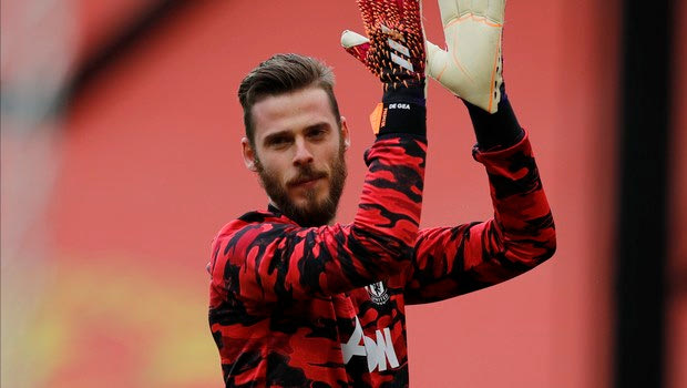 Manchester United's goalkeeper David de Gea warms up before the English Premier League soccer match between Manchester United and Fulham at Old Trafford stadium in Manchester, England, Tuesday, May 18, 2021. (AP Photo/Phil Noble, Pool) @ 2021 Paul Ellisu/Associated Press
