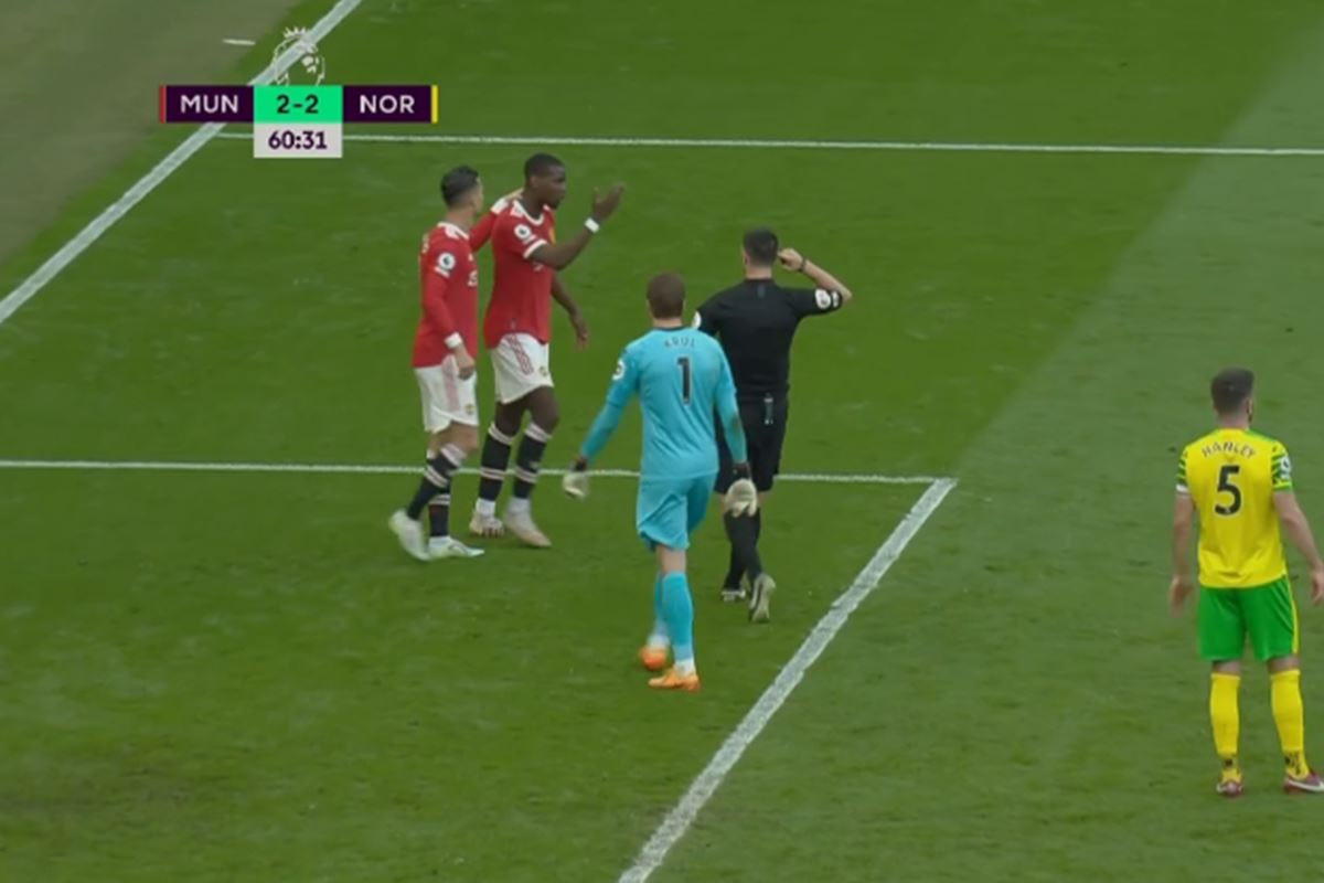 Σε ένα κόρνερ από αριστερά, ο Μαγκουάιρ επιχείρησε να πηδήξει για την κεφαλιά, όμως έπεσε πάνω σε παίκτη της Νόριτς και το σώμα του σηκώθηκε με τέτοιο τρόπο που το πόδι του κλότσησε τον Πογκμπά πίσω από το αυτί και του προκάλεσε πληγή.