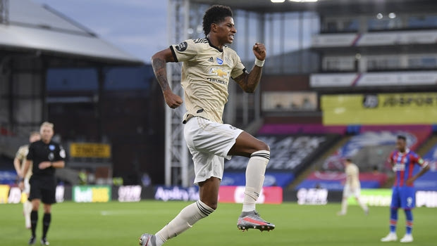 Manchester United's Marcus Rashford celebrates after scoring the opening goal during the English Premier League soccer match between Crystal Palace and Manchester United at Selhurst Park in London, England, Thursday, July 16, 2020. (AP Photo/Justin Setterfield, Pool)
