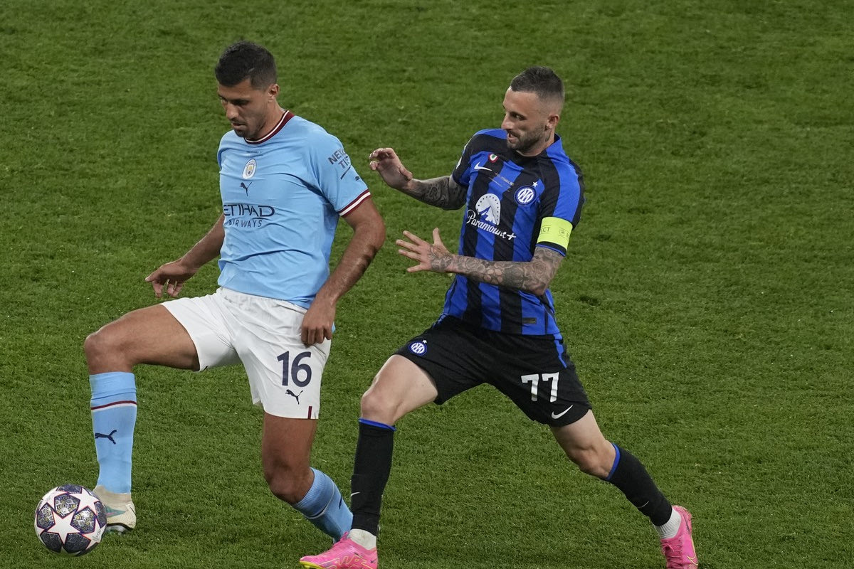Manchester City's Rodrigo, left, and Inter Milan's Marcelo Brozovic go for the ball during the Champions League final soccer match between Manchester City and Inter Milan at the Ataturk Olympic Stadium in Istanbul, Turkey, Saturday, June 10, 2023. (AP Photo/Thanassis Stavrakis) AP