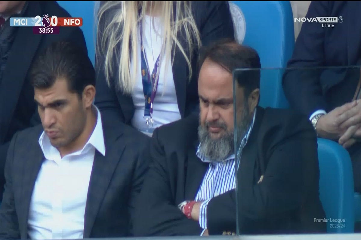 Ο Βαγγέλης Μαρινάκης μαζί με το γιο του, Μιλτιάδη Μαρινάκη, βρέθηκαν στις εξέδρες του Έτιχαντ για να παρακολουθήσουν την αναμέτρηση της Νότιγχαμ με αντίπαλο τη Μάντσεστερ Σίτι για την Premier League.
