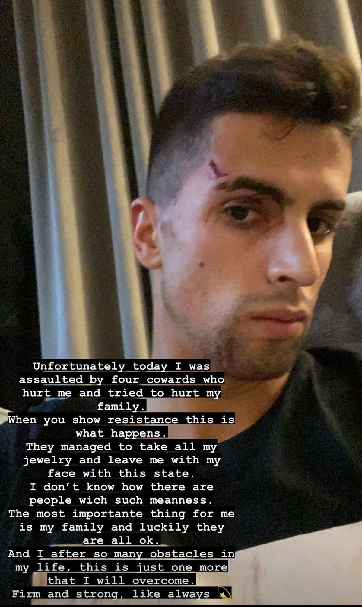 “Δυστυχώς σήμερα μου επιτέθηκαν τέσσερις δειλοί που προσπάθησαν να βλάψουν την οικογένειά μου. Όταν δείχνεις αντίσταση αυτό συμβαίνει. Κατάφεραν να μου πάρουν όλα τα κοσμήματα και να αφήσουν το πρόσωπό μου σε αυτήν την κατάσταση. Δεν μπορώ να καταλάβω πώς υπάρχουν άνθρωποι με τέτοιους τρόπους. Το πιο σημαντικό πράγμα για εμένα είναι η οικογένειά μου και είμαι τυχερός που είναι καλά. Και ακόμη ένα εμπόδιο στη ζωή μου, ένα ακόμη που θα υπερβώ” σχολίασε συγκεκριμένα.