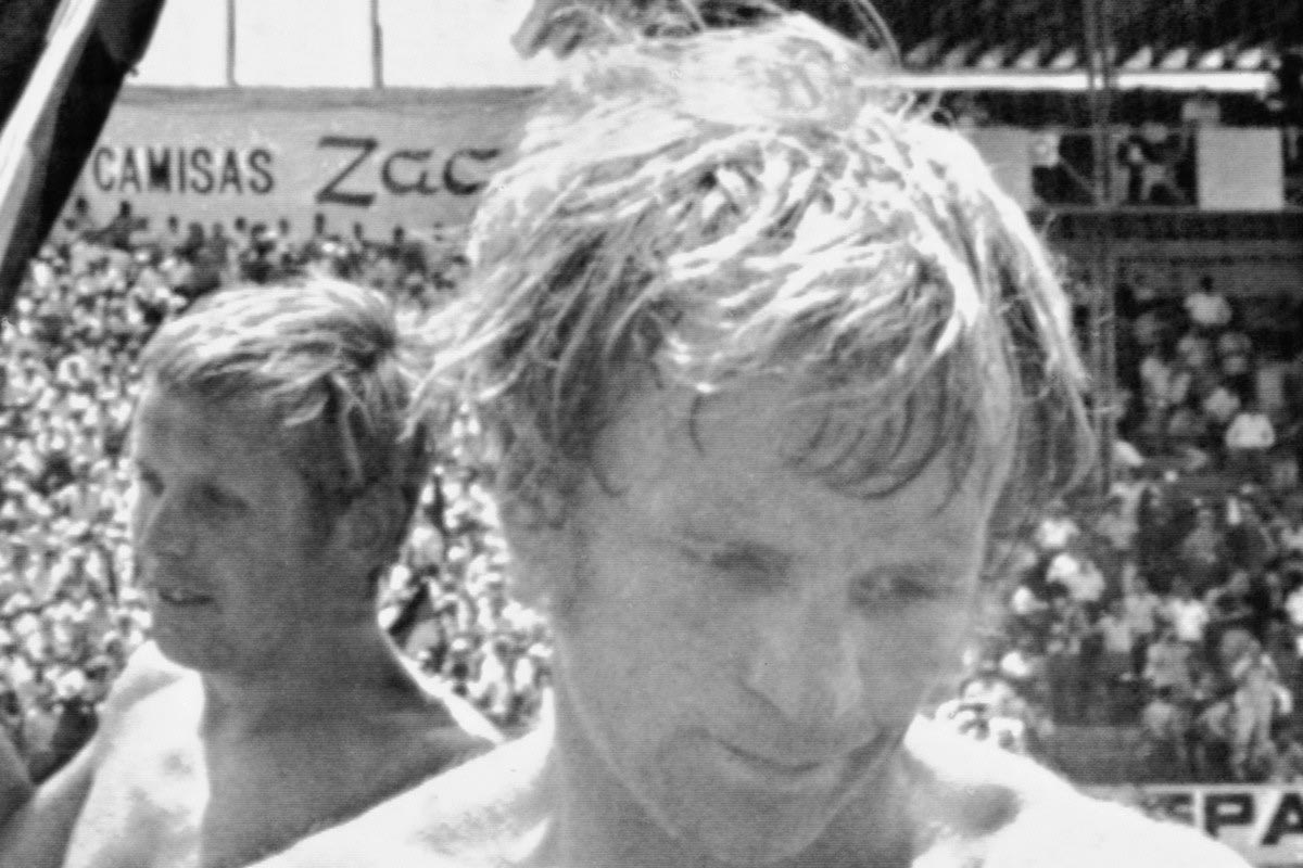 West German team captain Uwe Seeler, second left, hugs team mate Klaus Fichtel after their victory over England, in the Football World Cup quarter final in Leon. Mexico on June 14, 1970. England's Francis Lee, right, leaves ground dejectedly. West Germany defeated England 3-2 after extra time. (AP Photo/Lohmann)