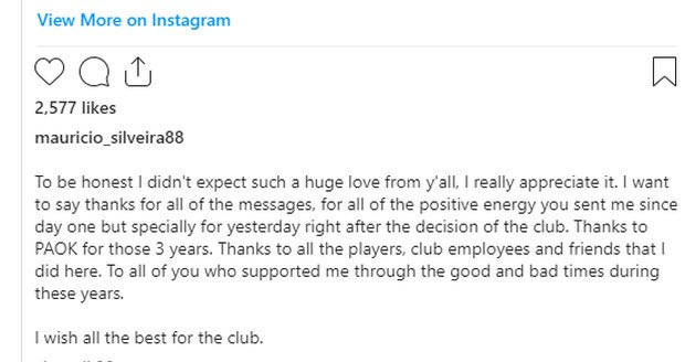 Ο Μαουρίσιο με μήνυμά του στο Instagramευχαρίστησε τον ΠΑΟΚ για τα επιτυχημένα τρία χρόνια που πέρασε στη Θεσσαλονίκη.