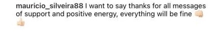 Ο Μαουρίσιο, μέσω ανάρτησής του στο Instagram αναφέρει τα εξής: “Θέλω να πω ένα ευχαριστώ για όλα τα μηνύματα στήριξης και τη θετική ενέργεια. Όλα θα πάνε καλά“.