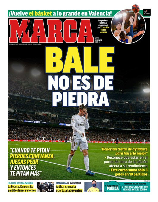 Η εφημερίδα Marca θέλησε την Πέμπτη (28/5) να υπερασπιστεί τον Μπέιλ και την κριτική που δέχεται τη φετινή χρονιά. “Ο Μπέιλ δεν είναι φτιαγμένος από πέτρα” αναφέρει το πρωτοσέλιδό της η ισπανική εφημερίδα. Παράλληλα, συμπληρώνει: “Όταν σου σφυρίζουν, χάνεις την αυτοπεποίθησή σου, παίζεις χειρότερα και σου σφυρίζουν ακόμη περισσότερο”.