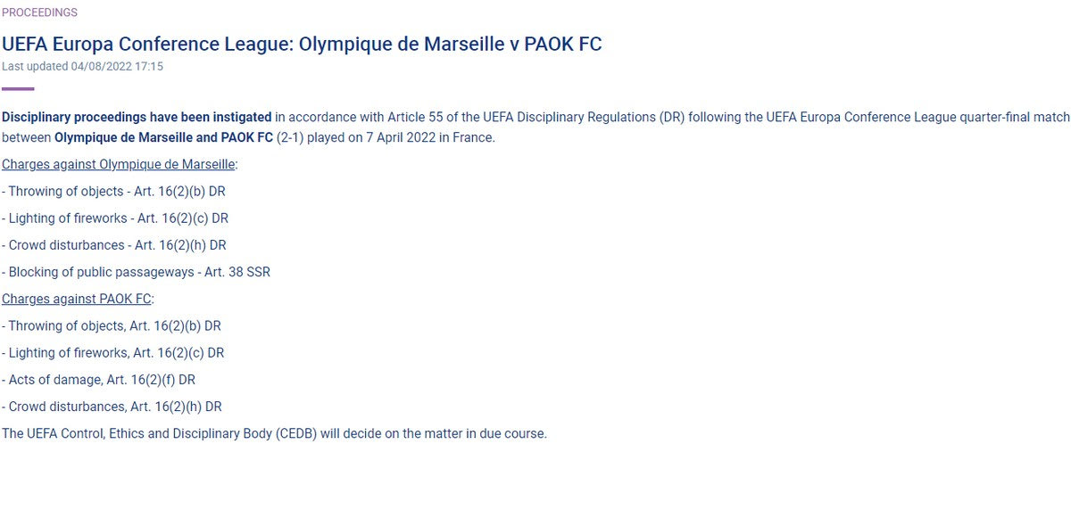 “Πειθαρχικές διαδικασίες έχουν κινηθεί σύμφωνα με το άρθρο 55 του Πειθαρχικού Κανονισμού της UEFA (DR) μετά τον προημιτελικό αγώνα του UEFA Europa Conference League μεταξύ της Μαρσέιγ και του ΠΑΟΚ που διεξήχθη στις 7 Απριλίου 2022 στη Γαλλία.
