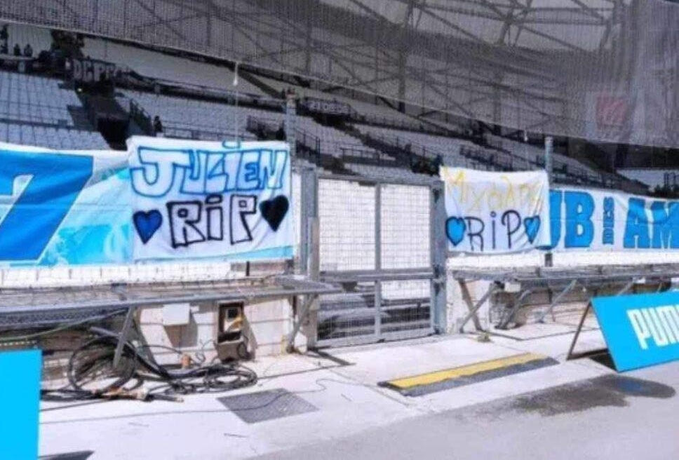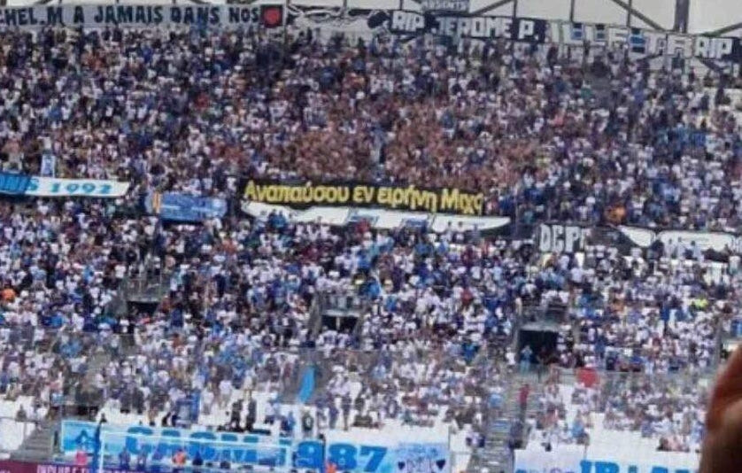 Οι φίλαθλοι της Μαρσέιγ κρέμασαν πανό στις κερκίδες του "Βελοντρόμ" στη μνήμη του Μιχάλη Κατσούρη που δολοφονήθηκε έξω από το γήπεοδ της ΑΕΚ στη Νέα Φιλαδέλφεια.