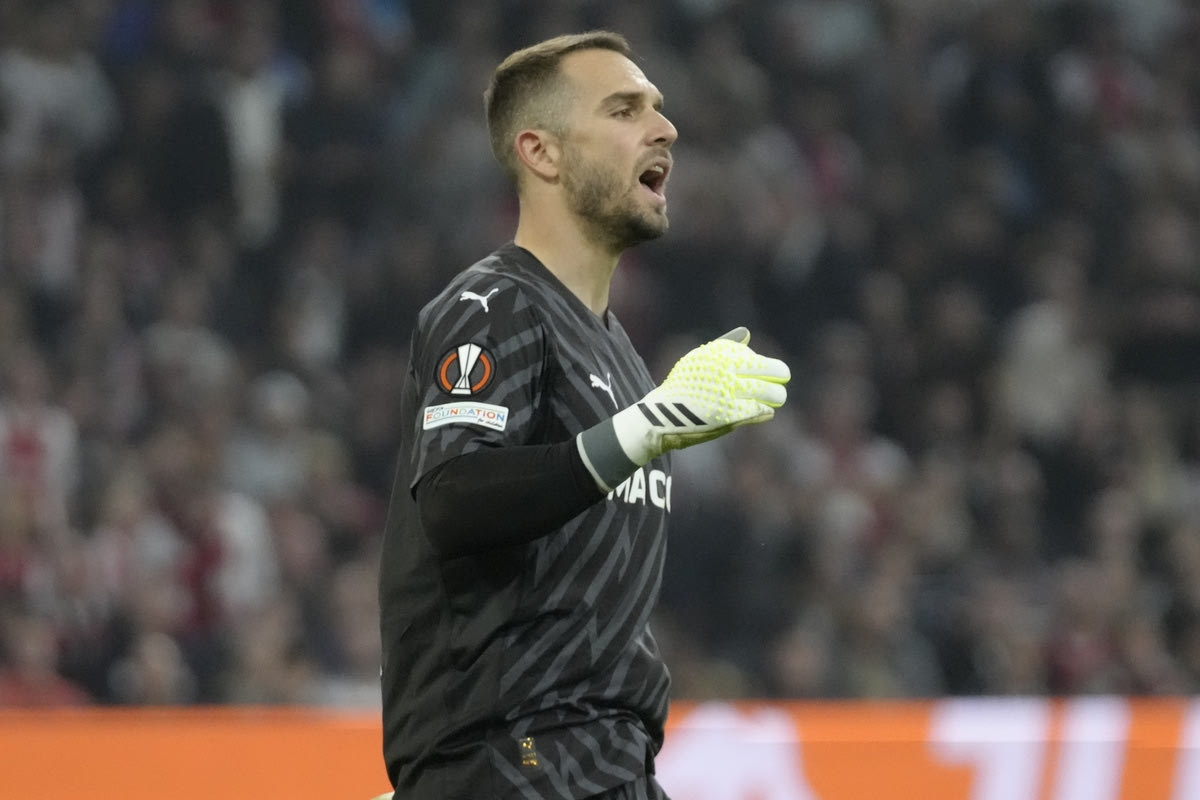 Marseille's goalkeeper Pau Lopez reacts during the Europa League group B soccer match between Ajax and Marseille at the Johan Cruyff ArenA stadium in Amsterdam, Netherlands, Thursday, Sept. 21, 2023. (AP Photo/Peter Dejong) AP