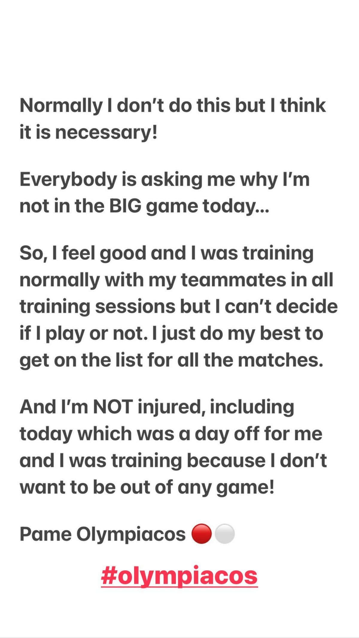 Δεν είμαι τραυματίας, ακόμη και σήμερα, η οποία ήταν ημέρα ρεπό για εμένα, ήμουν στην προπόνηση γιατί δεν θέλω να είμαι εκτός από κανένα παιχνίδι. Πάμε Ολυμπιακέ” έγραψε συγκεκριμένα.