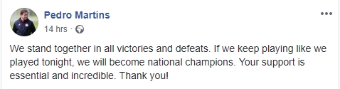 Με μήνυμά του στο λογαριασμό του στο Facebook, ο Πορτογάλος προπονητής του Ολυμπιακού, Πέδρο Μαρτίνς, τόνισε πως αν οι Πειραιώτες συνεχίσουν να παίζουν όπως απέναντι στον ΠΑΟΚ, θα είναι πρωταθλητές στο φινάλε της σεζόν και ας έχασαν το ματς.