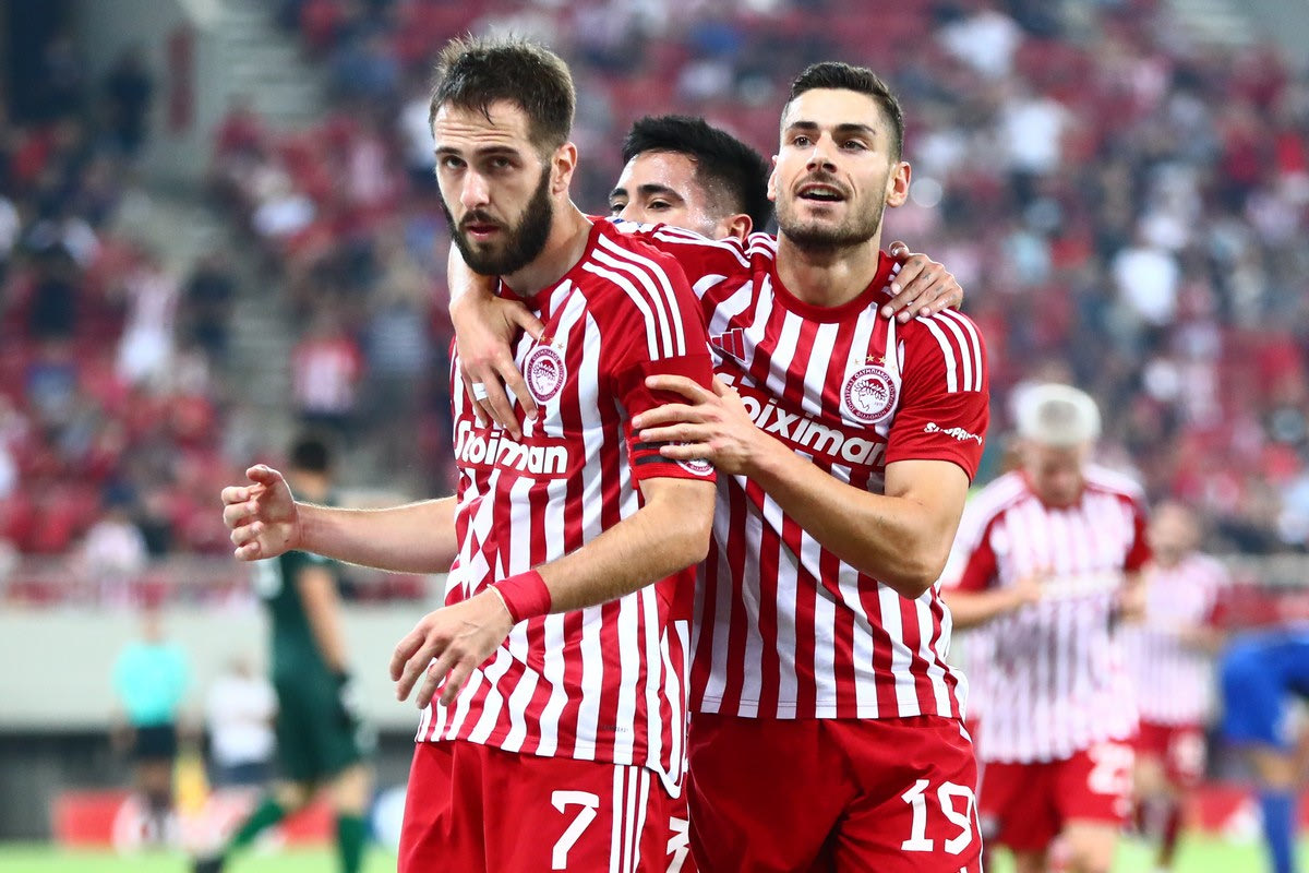 Φορτούνης και Μασούρας πανηγυρίζουν γκολ στο Ολυμπιακός - Λαμία