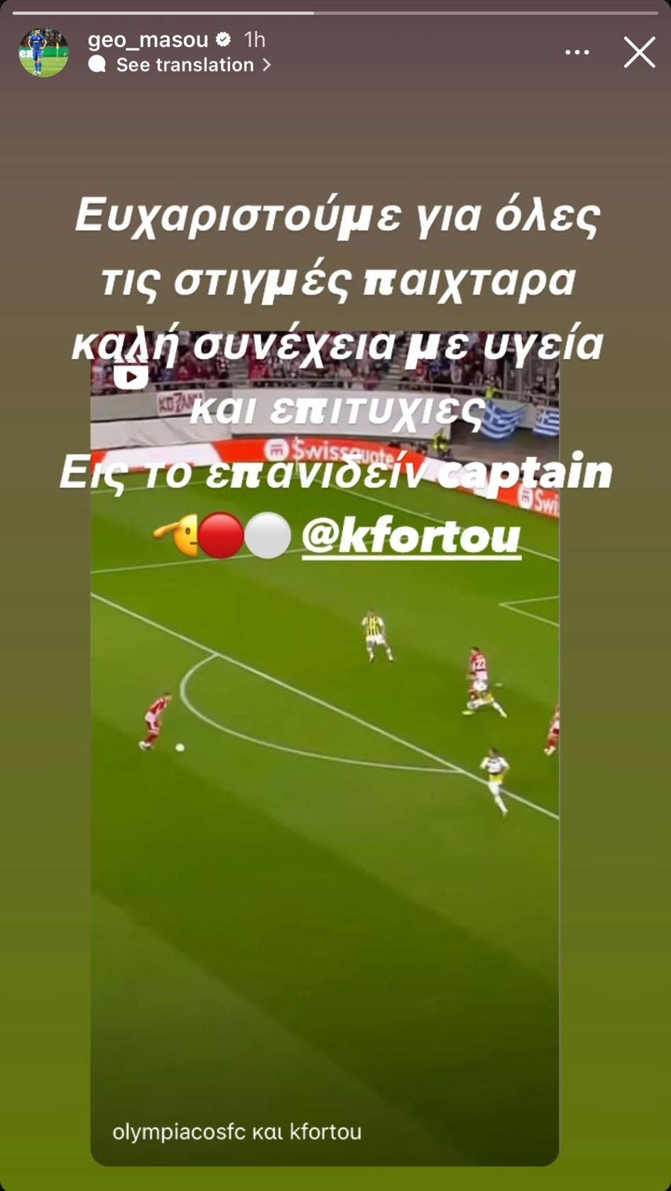 Ο Γιώργος Μασούρας αποχαιρέτησε τον Κώστα Φορτούνη με ένα instagram story στο οποίο αναδημοσίευσε το VIDEO που ανέβασε ο Ολυμπιακός.