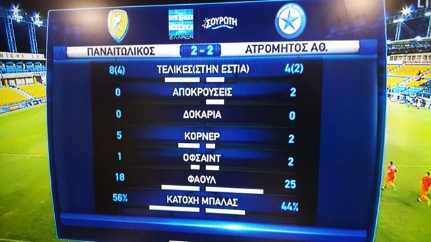Γήπεδο: Παναιτωλικού Διαιτητής: Γεώργιος Κομίνης (Θεσπρωτίας) Βοηθοί: Χρήστος Μπαλτάς (Αχαΐας), Άγγελος Πήττας (Ηλείας) ΠΑΝΑΙΤΩΛΙΚΟΣ (Μ. Χάβος): Κυριακίδης, Μαρινάκης (87′ Βασιλούδης), Χαντάκιας, Ροντρίγκες, Ρότσα, Μπεχαράνο, Ντιέκο Λόπες, Ρόσα, Ντίας (76′ Μοράρ), Μαζουρέκ (56′ Κλέσιο), Μαρκόβσκι. ΑΤΡΟΜΗΤΟΣ (Ντ. Κάναντι): Μίρκοβιτς, Κιβρακίδης, Χατζηϊσαΐας, Καρασαλίδης, Γιαννούλης (76′ λ. τρ. Μενσά), Μάντσον, Μπουσουλάτζιτς (66′ Ρισβάνης), Ουμπίντες, Ντιγκινί (67′ Βασιλακάκης), Μανούσος, Ντάουντα. Γκολ: 67′ Χαντάκιας, 79′ Ρόσα – 33′ Ντιγκινί, 69′ Ντάουντα Κάρτες: 9′ Ρότσα, 39′ Μαζουρέκ, 42′ Ντιέγκο Λόπες, 53′ Ντίας, 68′ Χαντάκιας – 44′ Μάντσον, 89′ Μανούσος |